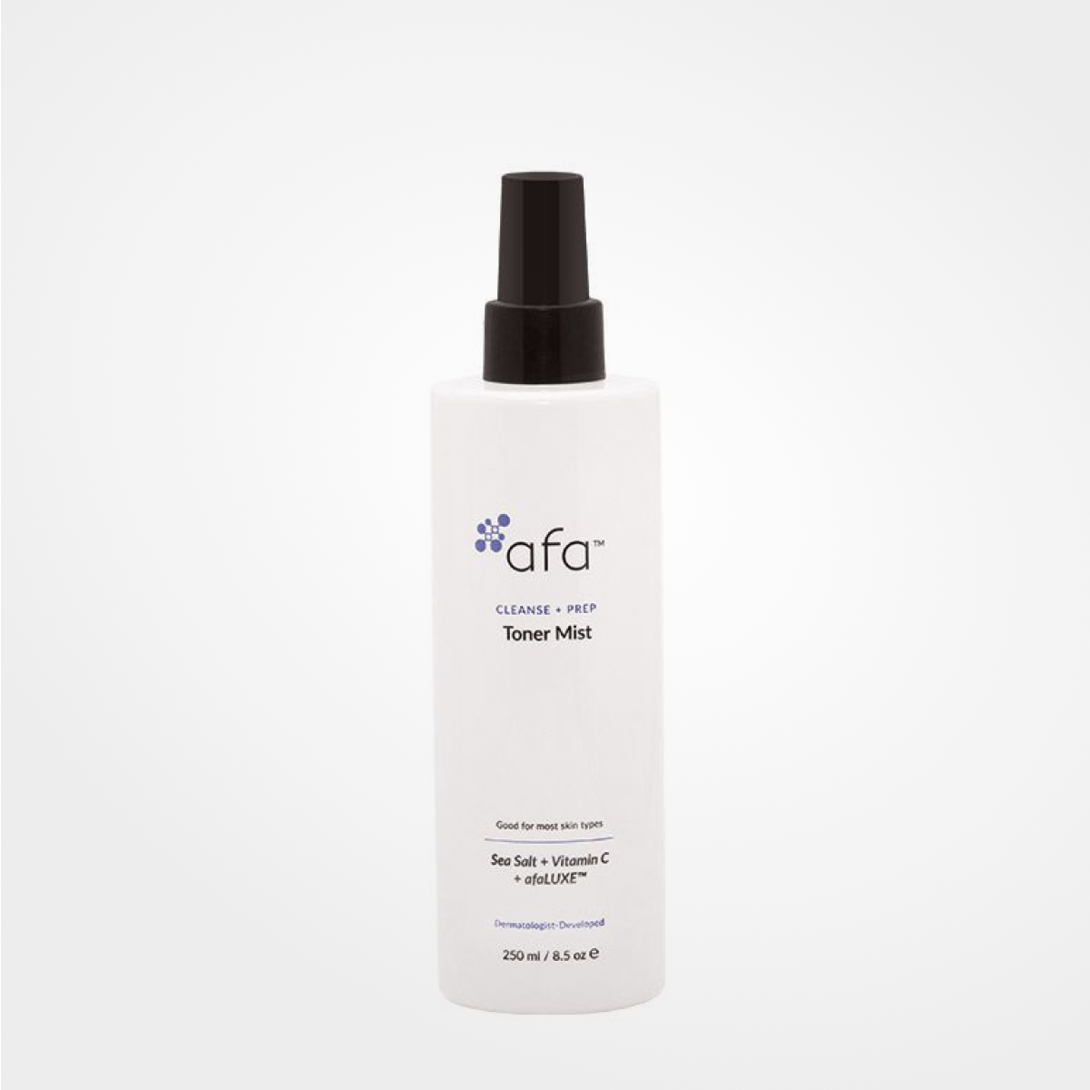La brume tonique afa®, adaptée à tous les types de peau, combine la technologie brevetée afaLUXE™ avec de l’acide L-ascorbique (vitamine C) et des minéraux de la mer Morte pour rafraîchir, apaiser et rétablir l’équilibre naturel de l’hydratation de la peau. Faite avec de l’eau purifiée et sans alcool ni autres astringents, cette brume tonique ne fait pas que rafraîchir, mais calme aussi la peau irritée.