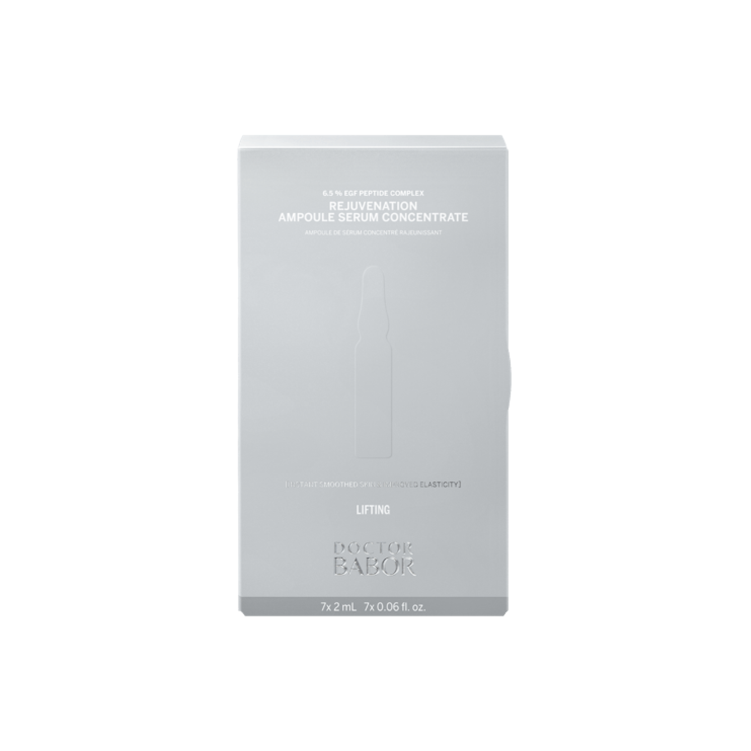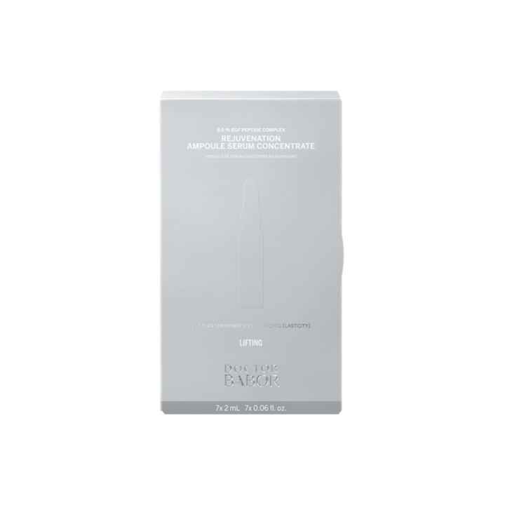 BABOR Rejuvenation Ampoule lisse, raffermit et hydrate en 7 jours. Avec un complexe peptidique EGF à 6,5% et de l’acide hyaluronique, il réduit les rides et améliore l’élasticité de la peau.