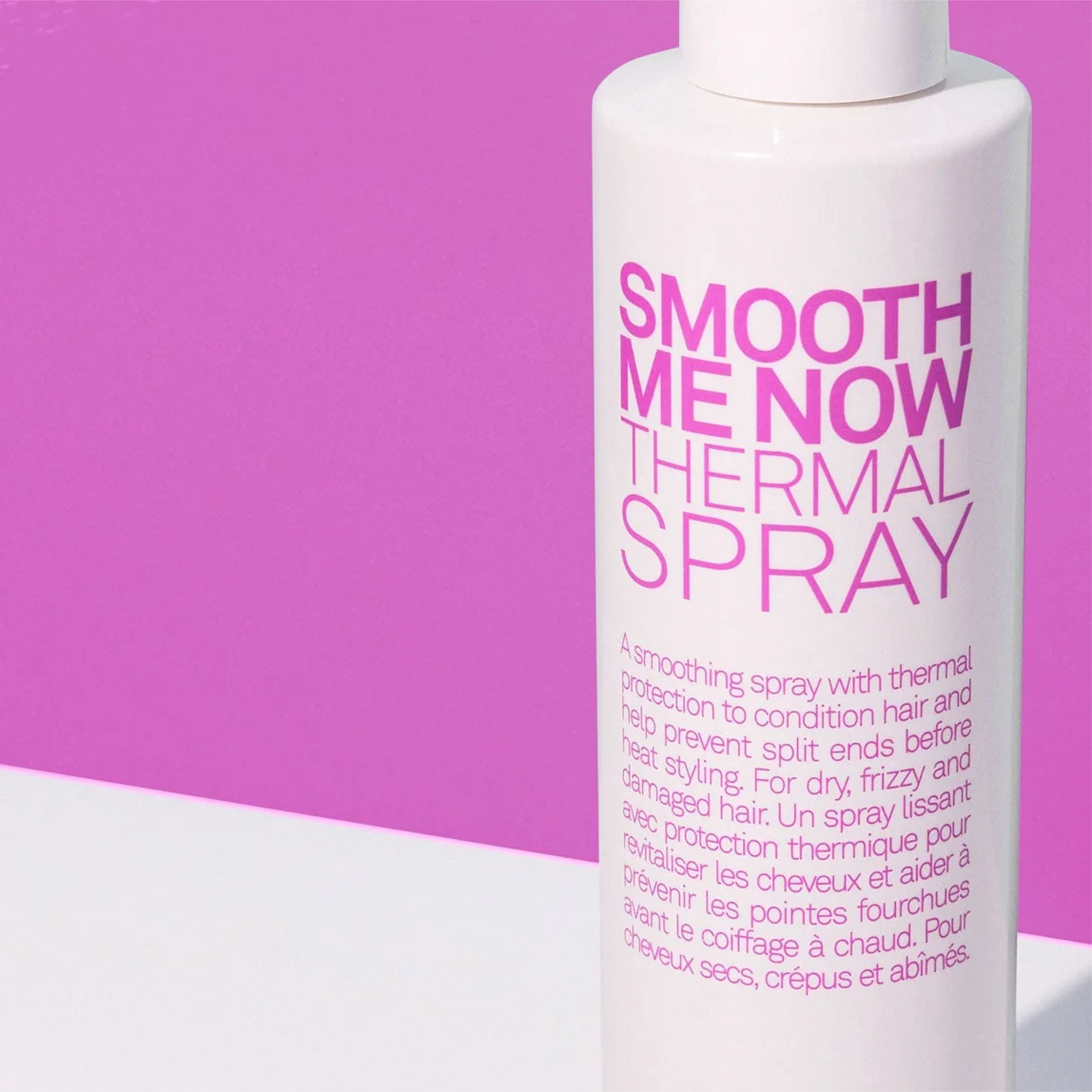 LE SPRAY THERMIQUE SMOOTH ME NOW est un protecteur thermique léger qui protège les cheveux des températures allant jusqu’à 220 °C (428 °F). Conçu pour combattre les frisottis et réduire les pointes fourchues, il lisse, adoucit et ajoute de la brillance — parfait pour préparer les cheveux avant tout coiffage à la chaleur.