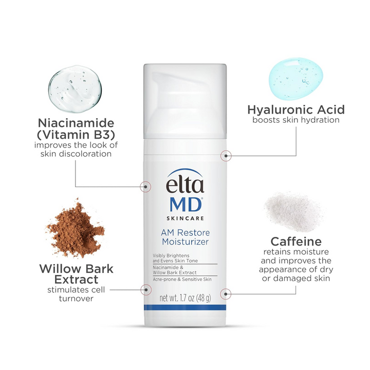 L’hydratant EltaMD AM Restore hydrate et renforce la barrière hydratante de la peau. Formulé avec de l’extrait d’écorce de saule pour soutenir l’exfoliation naturelle et de niacinamide (vitamine B3) pour uniformiser le teint et réduire l’apparence des taches de vieillesse, il laisse la peau visiblement plus lisse et éclatante. Non comédogène, sans parfum et sans colorant.