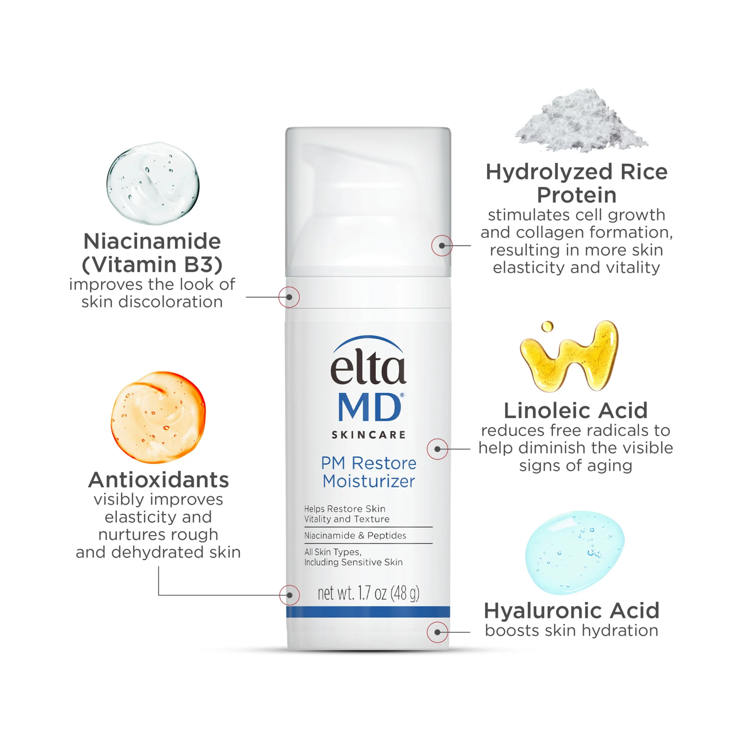 L’hydratant EltaMD PM Restore aide à restaurer la vitalité et la texture de la peau. La niacinamide et les antioxydants aident à améliorer le teint et la texture de la peau, tandis que l’acide hyaluronique et la céramide hydratent et renforcent la barrière hydratante de la peau. Le résultat est une peau qui paraît plus douce, plus lisse et plus lumineuse. Non comédogène, sans parfum.