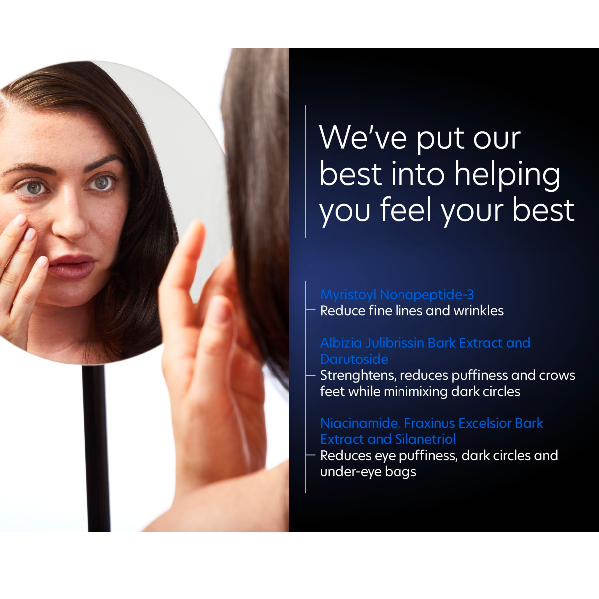 Un produit pour traiter simultanément les cernes, le gonflement, les ridules, les rides et les paupières tombantes.