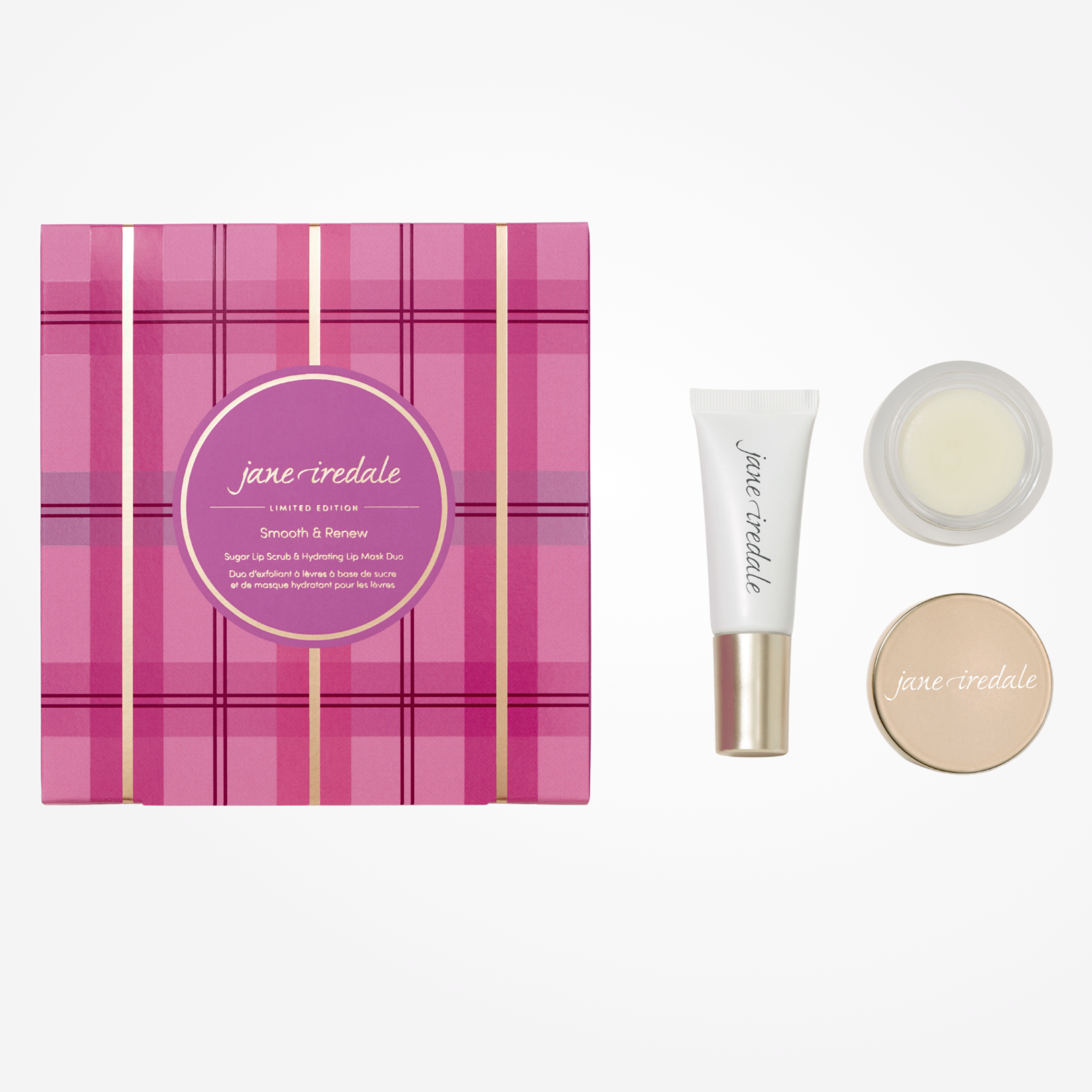 This limited edition Jane Iredale Smooth & Renew Lip Duo features a gentle Sugar Lip Scrub and Hydrating Lip Mask to smooth, soften and deeply hydrate lips.