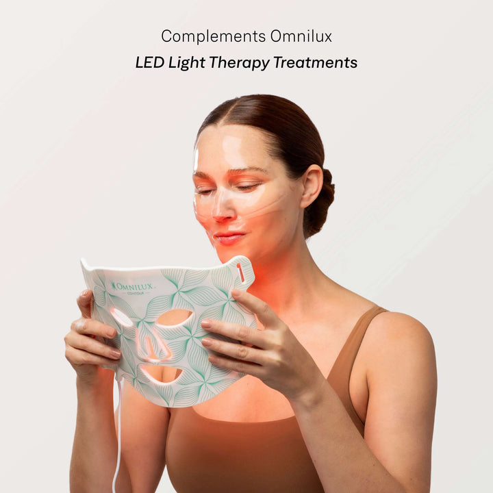 Infused with Hyaluronic Acid and natural ingredients, this gel-like sheet mask is crafted to boost your Omnilux Contour light therapy. Its light-permeable design ensures optimal absorption of both light and Hyaluronic Acid, providing an ultra-hydrating, cooling, and nourishing experience. Enhance your LED treatments or enjoy it on its own for deep hydration.